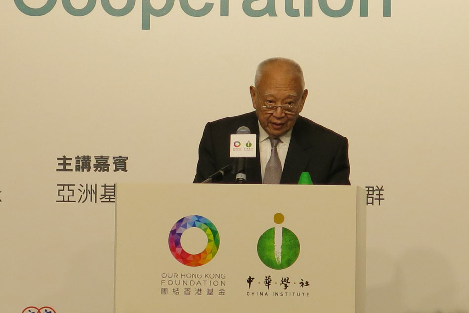Former Hong Kong Chief Executive Tung Chee-hwa welcomes AIIB President Jin Liqun to give a speech in Hong Kong, April 7th, 2016. It is organized by the non-government thinktank Our Hong Kong Foundation, which is established in 2014 led by Tung Chee-hwa . [Photo: CRIENGLISH.com/Li Jing]