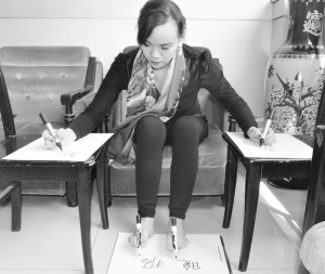 Chen writes with both hands and feet.(Photo/YanZhao Evening News)