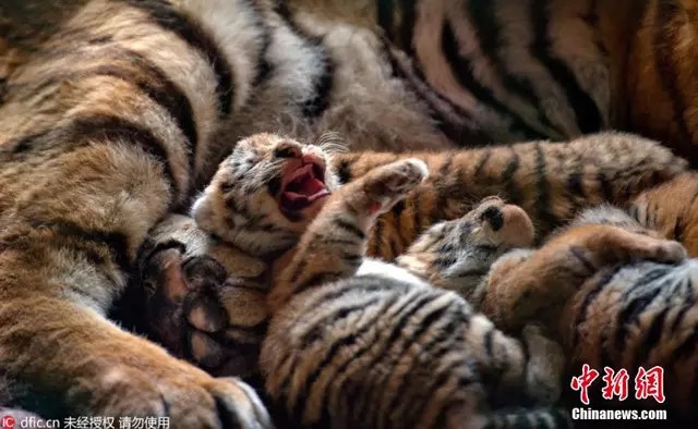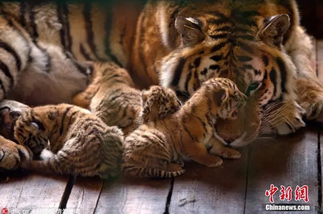 Photos taken on April 8, 2016, show a Siberian tiger mother frolicking with her one-week-old baby cubs in a tiger center in northeast China’s Shenyang. The 6-year-old mother has already given birth to 4 cubs this year, another 5 last year, and 4 more the year before last. She now has a total of 13 babies. It is an extremely rare case, and the staff members at the tiger center nicknames this female tiger as “heroine tiger mom”.