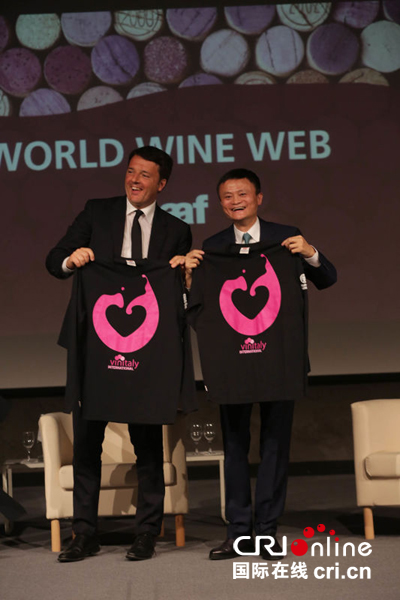 Italy's Prime Minister Matteo Renzi (L) is with Founder and Executive Chairman of Alibaba Group Jack Ma at the Vinitaly wine exhibition in Verona, Italy, April 11 2016. [Photo/CRI]