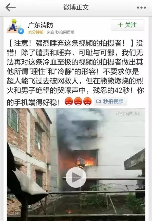 The Fire Corps of Guangdong province made five posts on their official Sina Weibo account on Friday and Saturday, confirming that the man in the video had died in the accident and blaming the outcome on the video and its author.(Weibo/File Corps of Guangdong province)