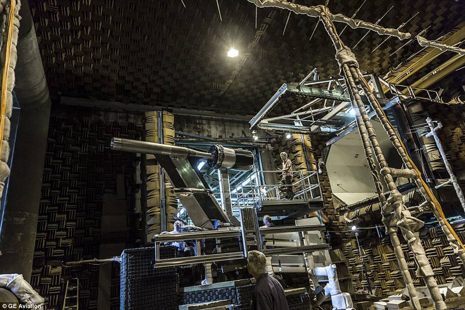 There are 16 fourth-generation carbon-fiber fan blades in the design that are at the front of the engine and feed air to the 11-stage high-pressure compressor. According to the firm, no other commercial engine has a pressure ration (27:1) that's higher. GE has been testing the new design for the GE9X carbon fiber blades on a scaled-down testing rig at Boeing (pictured)