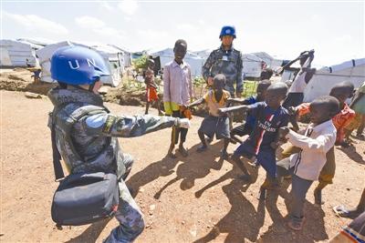 Zhang Yuanyuan (first from the left) with the South Sudanese children. (Photo/PLA Daily)