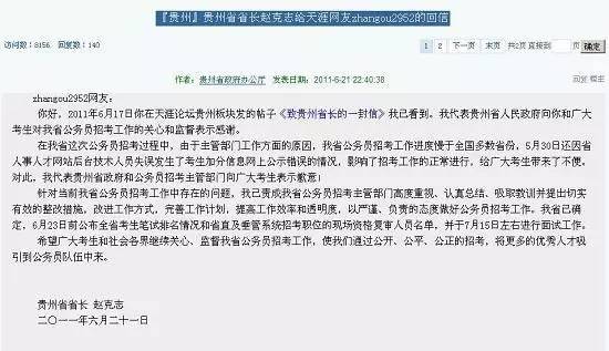 An internet user published an open letter to Guizhou governor in June 2011 to criticize the nontransparent and inefficient procedures in the examinations of civil servants in Guizhou province.