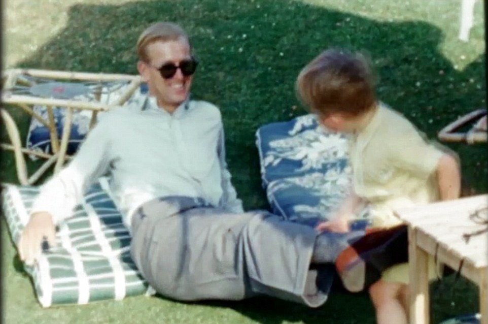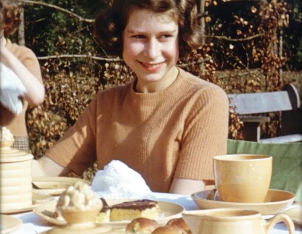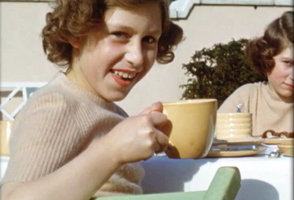 Seeing herself with her parents, the Queen reminisces: ‘My father is reading the newspaper for some mysterious reason.’ George VI is also seen entertaining the family by donning a comedy beard