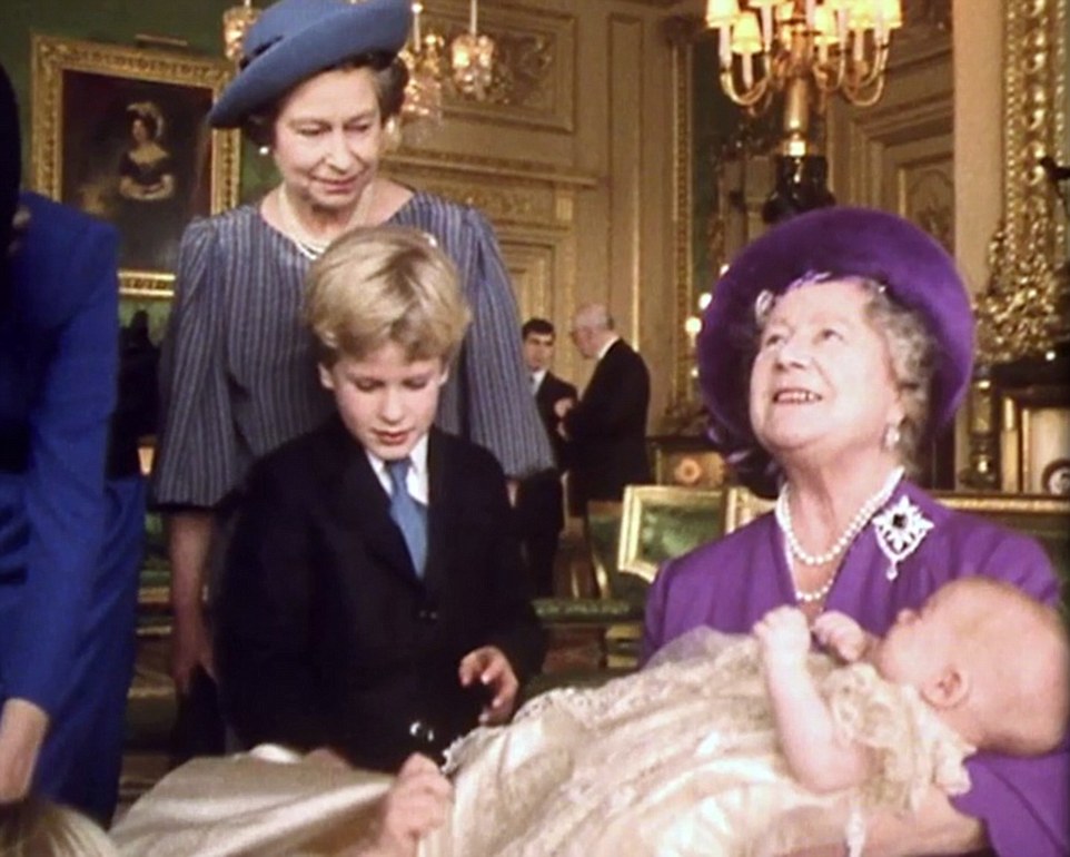 Mum looked lovely in blue: Baby Harry gazes at Diana at his private christening party in 1984 at Windsor Castle. The Prince today looks fondly at footage of his late mother. ‘Mummy looks great in blue [but] I’m still not convinced about the dress I’m in!’