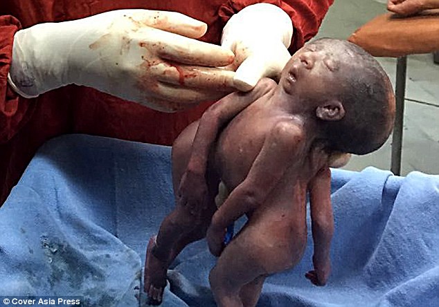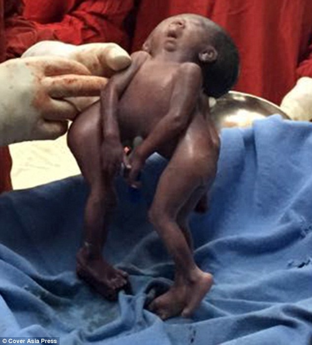 The babies, who each had their own heart, arms and legs were born weighing 2lbs 6oz at a hospital in Rajkot, Gujarat, eastern India.