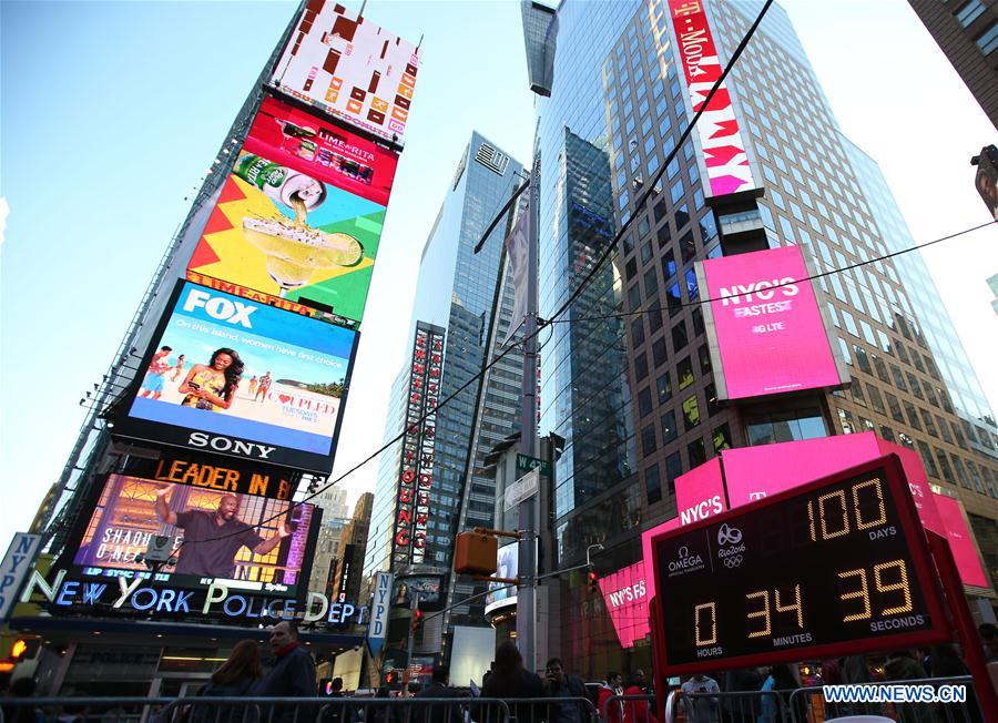 NEW YORK, April 28, 2016 (Xinhua) -- Photo taken on April 27, 2016 shows the countdown clock displayed at Times Square in New York, the United States. Team USA's "Road to Rio Tour" was held at Times Square on Wednesday to mark the 100-Day countdown to the 2016 Olympic Games in Rio de Janeiro. More than 70 Olympic and Paralympic athletes participated in the event and shared their spirit and excitement of the Games with fans here. (Xinhua/Qin Lang) |