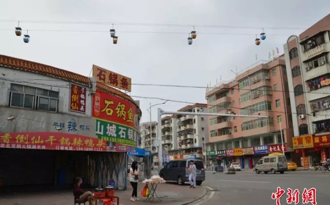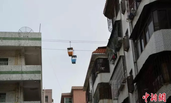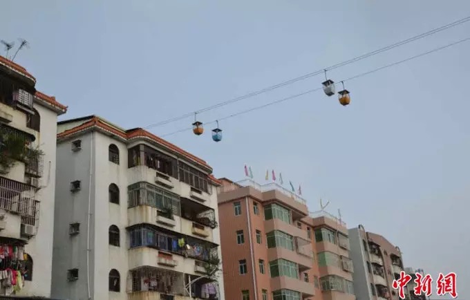 Photos taken on April 19, 2016 show cable cars running between two parks over the bustling street and residential buildings in Dongguan, south China’s Guangdong province. This makes an interesting sight to see in the downtown area.