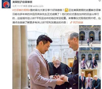 Hanscom Smith, a senior diplomat and the U.S. Consul General in Shanghai, married his Chinese male partner Lyu Yingzong (Eric Lu) during his holiday leave in San Francisco, California.