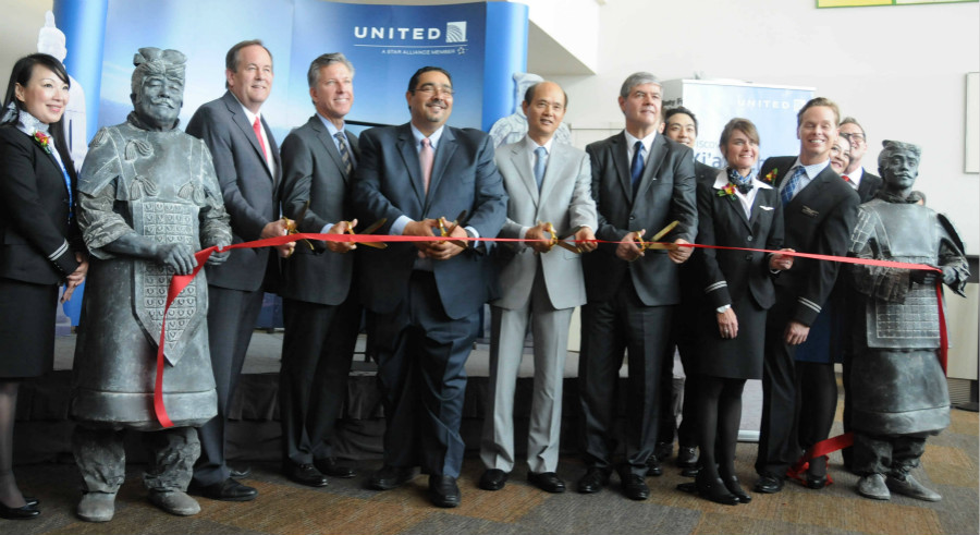 United Airlines holds a ribbon-cutting ceremony to launch its non-stop flight service between San Francisco and China's Xi'an on May 8, 2016. (Photo by Ma Dan)