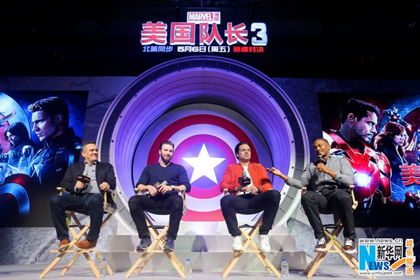 Director Joe Russo behind Marvel's Captain America franchise promotes the latest "Captain America: Civil War" in Beijing, capital of China, April 19, 2016. Main cast Captain America-Chris Evans, Winter Soldier-Sebastian Stan and Falcon-Anthony Mackie also join him. (Xinhuanet photo)