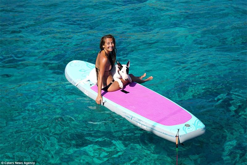The couple claim Feijao has adapted well to sailing life and loves chilling on the deck and at the beach - but is not a keen swimmer, instead preferring paddleboarding (pictured)