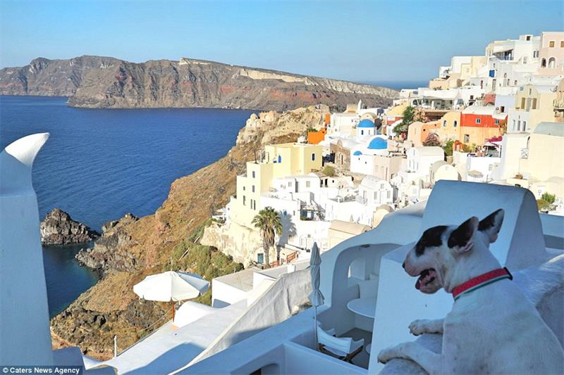 So far, Sarah, Renato and Feijao have been to 21 countries and territories. Here Feijao explores the stunning island of Santorini, Greece