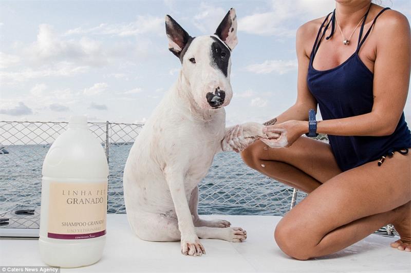 Pampered in paradise: Feijao gets shampooed on board the couple's sailing boat which has taken them across the Atlantic Ocean