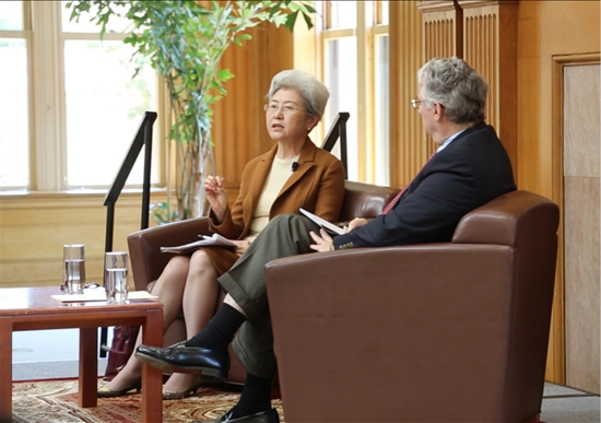 Fu Ying (L) answers questions from Stanford University professor Thomas Fingar and audiences on May 10, 2016. (People's Daily Online/Gong Xin)