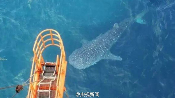 On May 5, a Weibo account of an offshore drilling platform posted the image of a whale shark swimming in the sea near Weizhoudao Island in Beihai, south China's Guangxi.(Photo from Weibo)