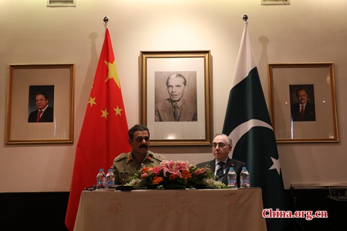 Pakistan's military spokesperson Lieutenant General Asim Saleem Bajwa (L) and Ambassador of Pakistan to China Masood Khalid (R) at a press conference in Beijing on May 17, 2016. [Photo by Gong Jie/China.org.cn]