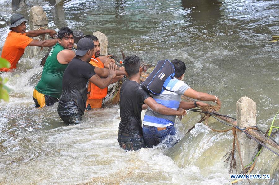 Rescue workers reinforce levees to prevent floods in Kelaniya District, Sri Lanka, on May 19, 2016. The death toll from Sri Lanka's flash floods and landslides rose to 63 on Friday as water levels in many districts continued to rise owing to heavy rains, the Disaster Management Center said. (Xinhua/Gayan Sameera)