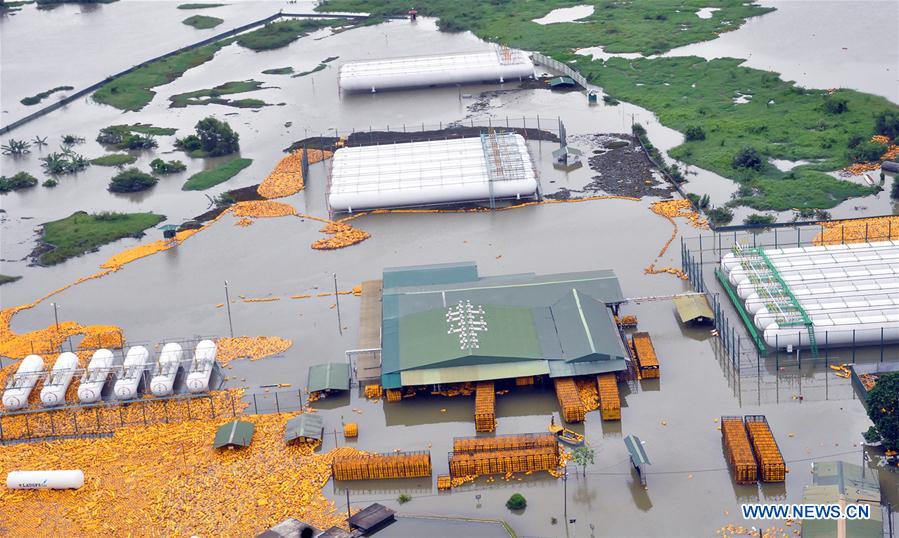 Photo taken on May 19, 2016 shows a bird's-eye view of a flooded factory in Kelaniya District, Sri Lanka. The death toll from Sri Lanka's flash floods and landslides rose to 63 on Friday as water levels in many districts continued to rise owing to heavy rains, the Disaster Management Center said. (Xinhua/Ajith Perera)