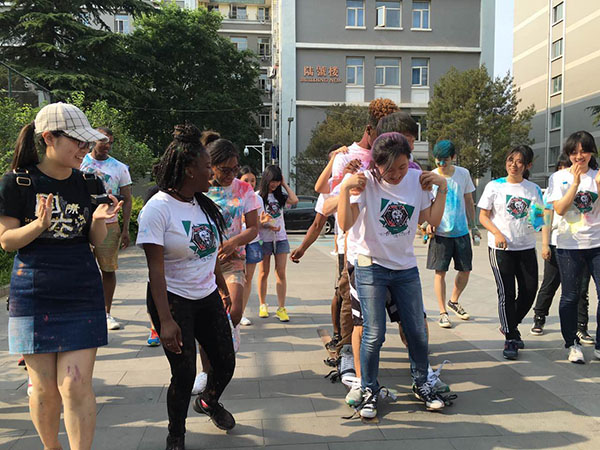 On May 21, more than 200 students from Beijing Foreign Students University and Clark Atlanta University have fun in a color-run, which means people throw washable colorful paint on each other while running. [Photo by Yan Dongjie/chinadaily.com.cn]