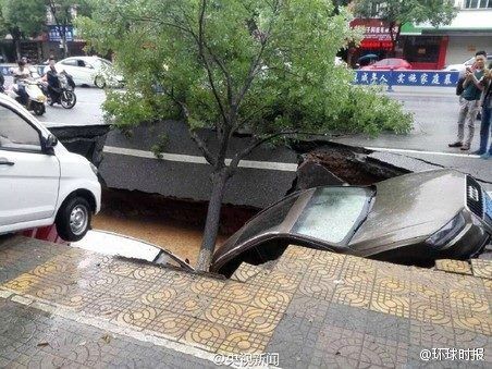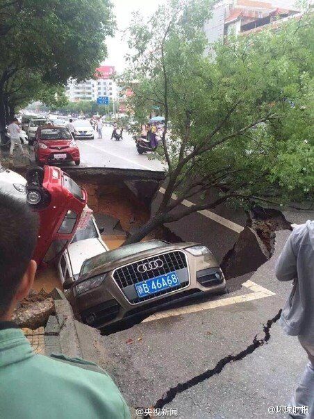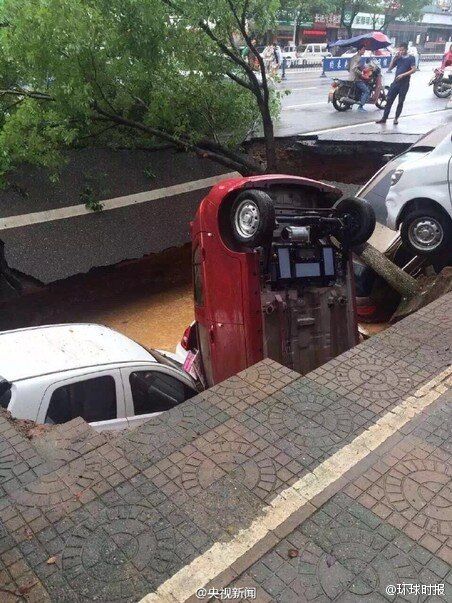 Horrific: a 4-meter deep cave-in suddenly emerged & swallowed 4 cars parked on road in southeast ??China?'s Jiangxi province on Saturday. Thankfully, no casualty was reported.