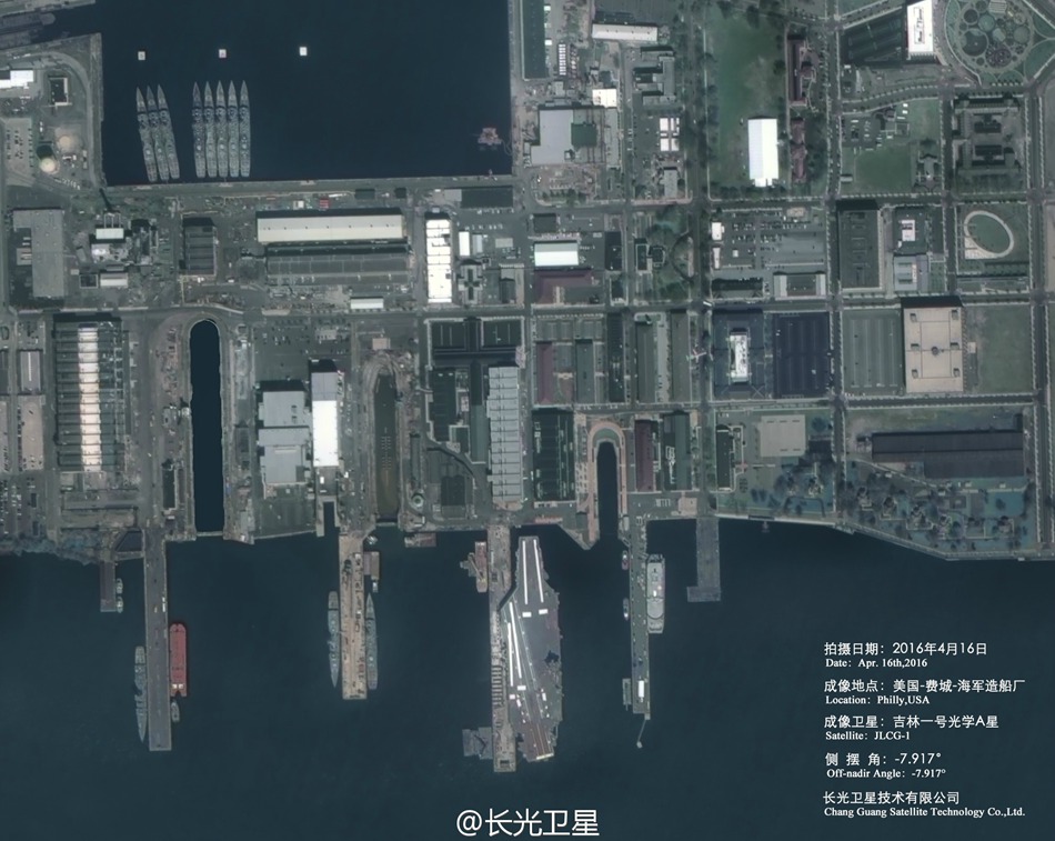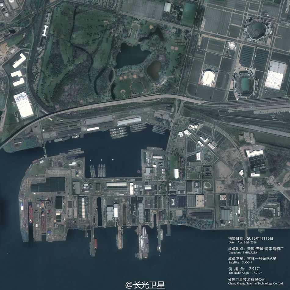 According to a research by the Global Times, this group of images of The Navy Yard or the Philadelphia Naval Shipyard was taken on April 16 by Jilin-1, China's first commercial remote sensing satellite, produced by Chang Guang Satellite Technology Co. Ltd.