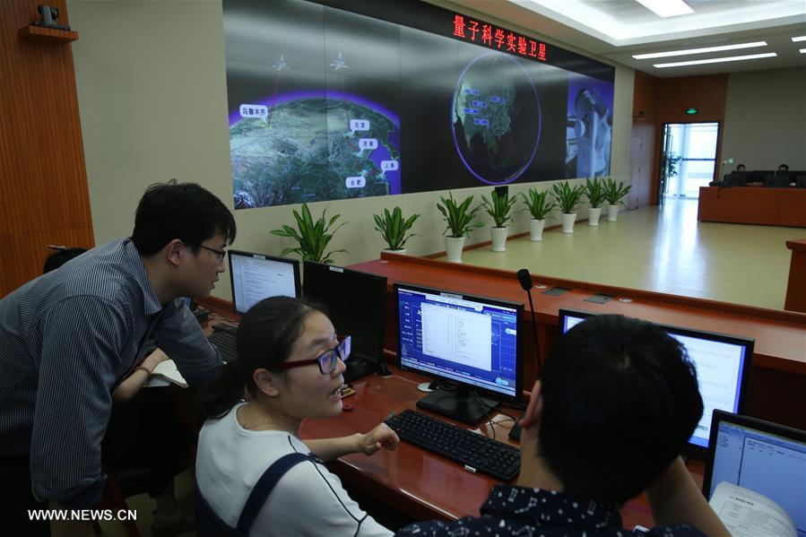 Staff members work at the general control center for the quantum secure communication in Shanghai, east China, May 25, 2016.