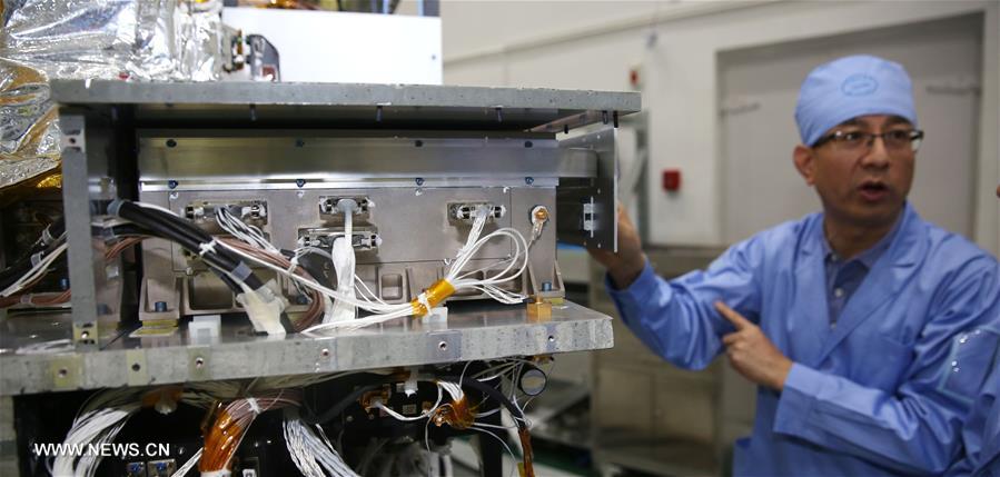 General engineer Zhu Zhencai introduces the "quantum entanglement source" on the quantum satellite at Shanghai Engineering Center for Microsatellites, under the Chinese Academy of Sciences, in Shanghai, east China, May 25, 2016.