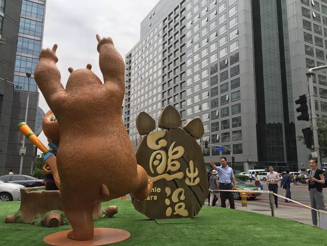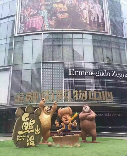 The two bears from the Chinese cartoon Boonie Bears were first erected on Sunday at the entrance of Seasons Place, a shopping mall on the Financial Street in Beijing, in order to celebrate Children’s Day which fell on Wednesday this year.