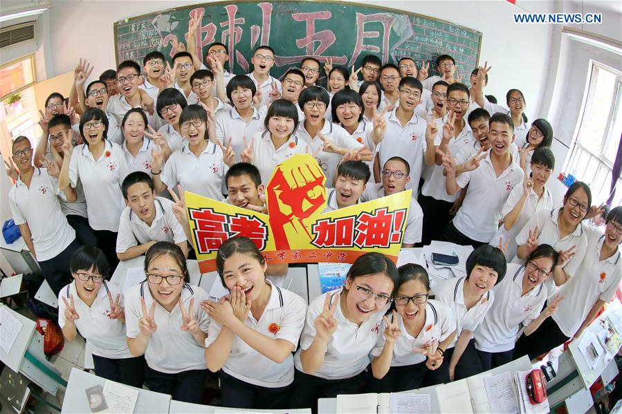 Senior high students pose for photos as attending an activity for relaxation in No. 2 High School of Hengshui, north China's Hebei Province, May 24, 2016. Students preparing for 2016 college entrance exam have entered the sprint stage of their review. (Xinhua/Zhu Xudong)