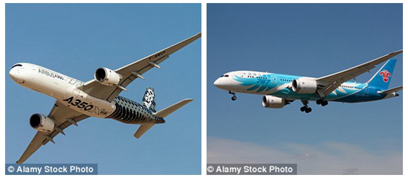 Both Airbus, and their rival, Boeing, are using 3D printing to make parts for some of their planes, such as the A350 (left) and B787 Dreamliner (right).