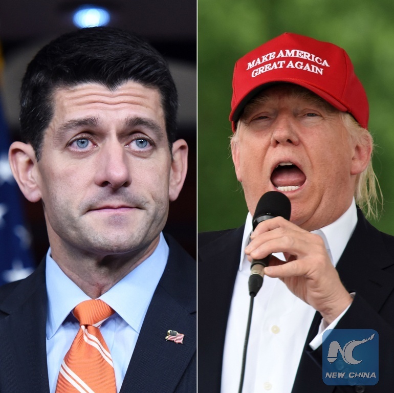 Combo photos show U.S. House Speaker Paul Ryan(L) speaking at a news conference at the U.S. Capitol in Washington D.C., the United States on Nov. 5, 2015, and Republican presidential candidate Donald Trump speaking to motorcyclists participating in Rolling Thunder parade in Washington D.C., the United States on May 29, 2016. U.S. Republican House SpeakerPaul Ryan announced on Thursday that he would vote for the presumptive Republican presidential nominee Donald Trump in November. (Xinhua/Yin Bogu)