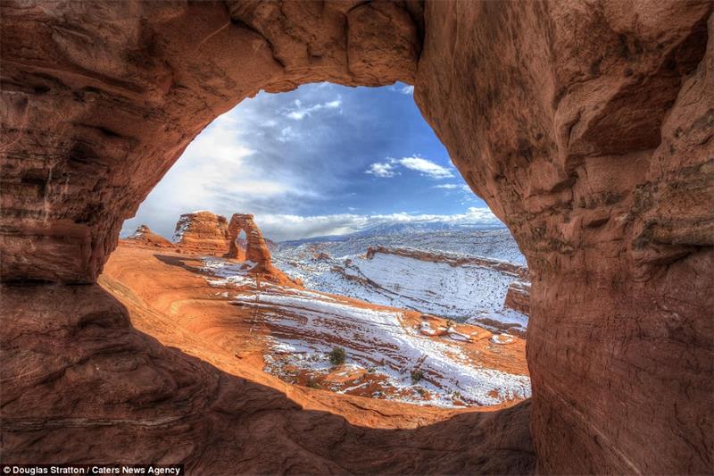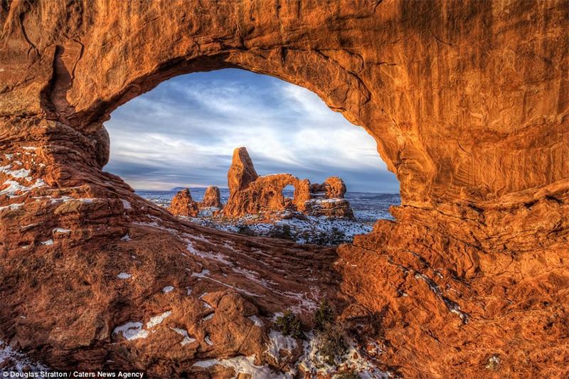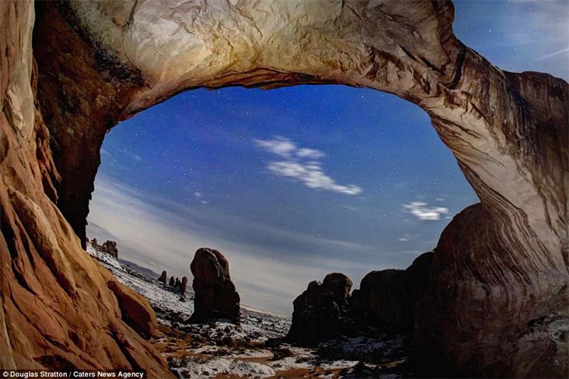 Stratton said: 'Photographing and exploring these natural places is food for your soul.' Above, an arch captures the sky at twilight in the American Southwest
