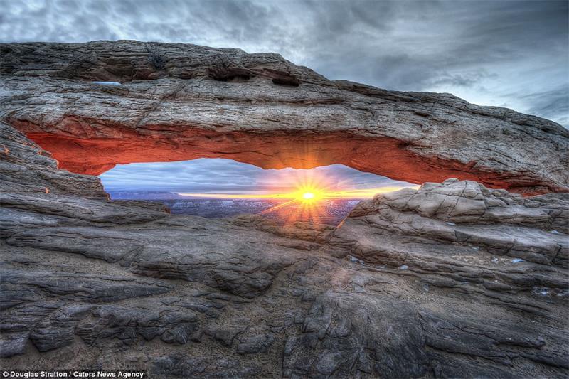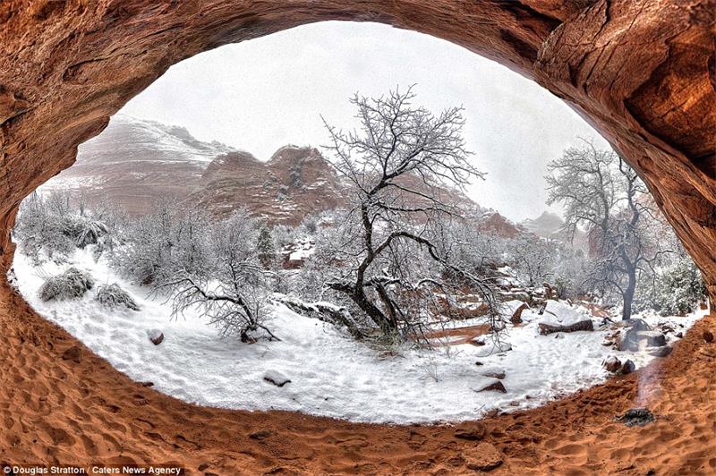 These images were taken in the wilderness of Arizona and Utah by photographer Douglas Stratton. Pictured, sunlight streaming through the natural frame of a rock formation
