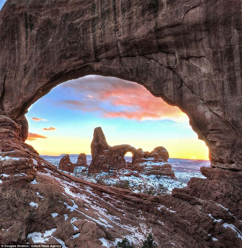 The photographer used the natural cave-like windows in the rock formations to frame his images like this one of a winter sunset