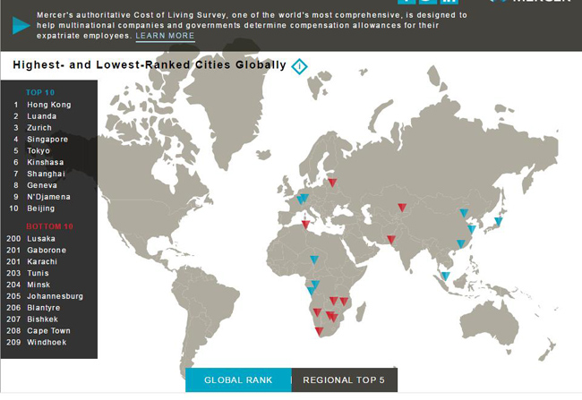 The report, issued on Wednesday by Mercer consulting group, said Hong Kong overtook the former costly champion Angola’s capital Luanda, which now ranks 2nd. The two are followed by Zurich, Singapore and Tokyo.