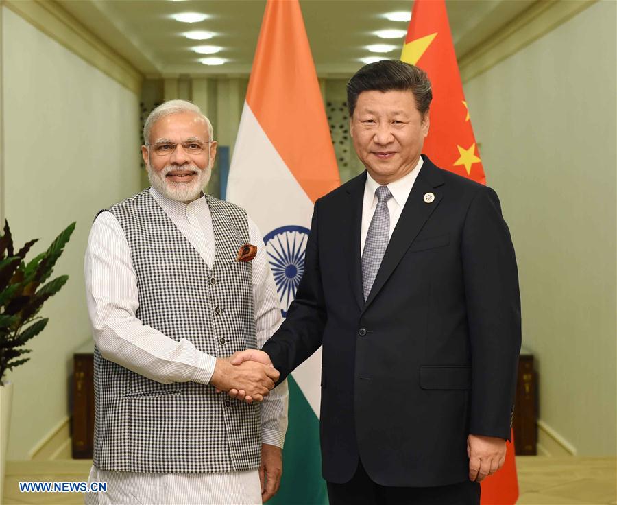 TASHKENT, June 23, 2016 (Xinhua) -- Chinese President Xi Jinping (R) meets with Indian Prime Minister Narendra Modi in Tashkent, Uzbekistan, June 23, 2016. (Xinhua/Rao Aimin)