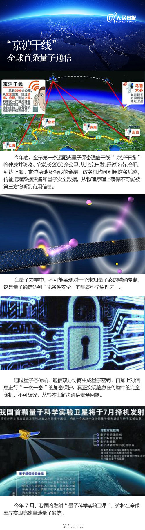 China started developing its quantum satellite in 2011, and launched the quantum optical fiber communication network project, the Beijing–Shanghai line, in 2013. The Beijing–Shanghai quantum private communications line will cover a total length of more than 2,000 kilometers, connecting a network of numerous cities including Beijing, Jinan, Hefei and Shanghai. It will be the world's first wide-area optic fiber quantum private network.