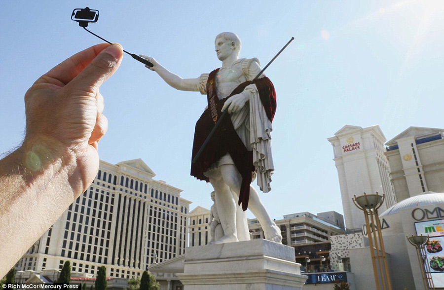 In his latest photographs, Rich has turned the statue of Julius Caesar, which holds court outside the iconic Caesars Palace hotel in Las Vegas, into a selfie stick-wielding tourist.