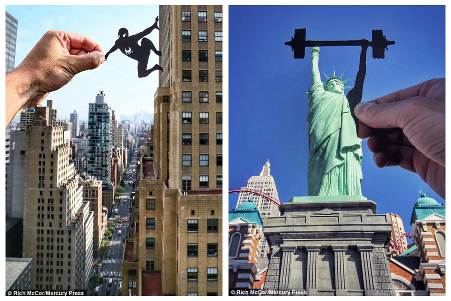 Over the past six months the 29-year-old has turned his attention to transforming global hotspots using silhouettes, including putting Spiderman on a New York skyscraper (left) and making the Statue of Liberty at the New York-New York resort in Las Vegas a weightlifter (right)