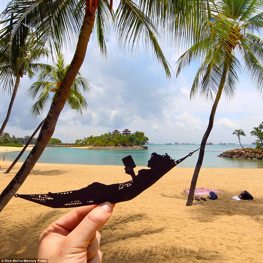In another shot, Rich conjured up a peaceful beach scene when he was visiting Sentosa Island in Singapore, using a tiny figure of a woman reading in a hammock.