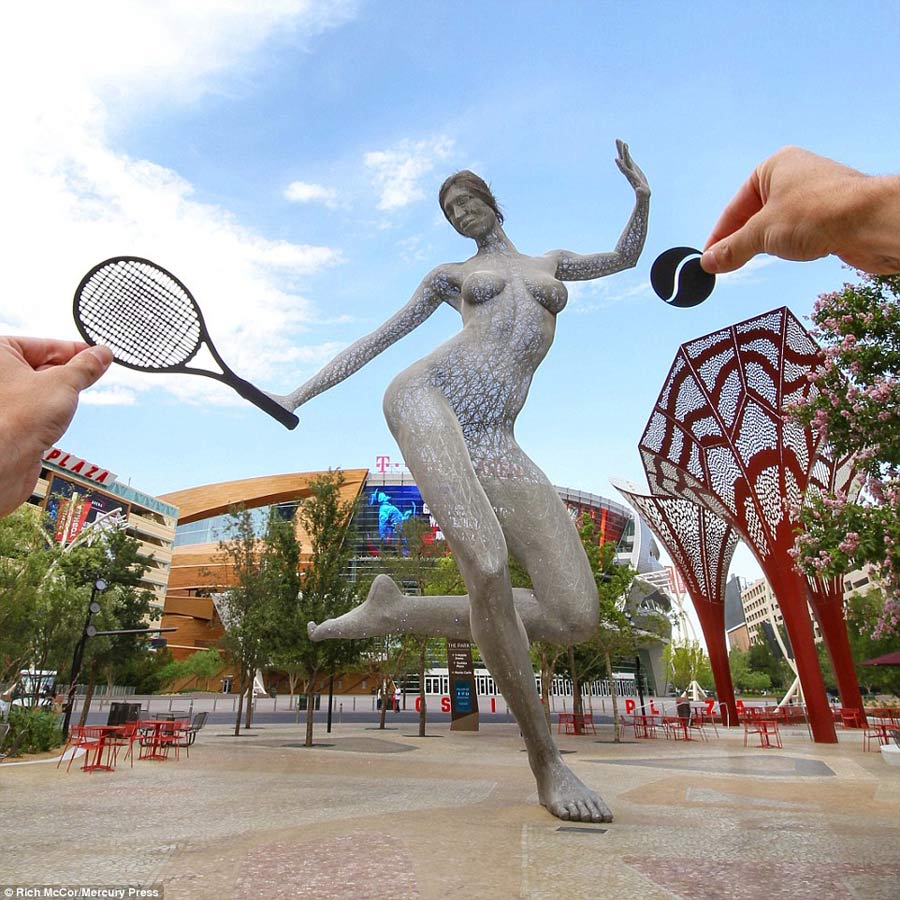 At the Bliss Dance Sculpture in Las Vegas, Rich's cut-outs of a racket and ball make the scene resemble a large tennis player.
