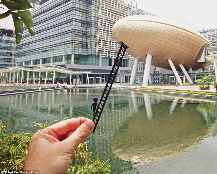 Rich, who has jacked in his job at a creative agency to travel the world through his hobby, saw his quirky photographs first go viral last year. Pictured is his image of an alien walking up a ladder into the Hong Kong Science Park.