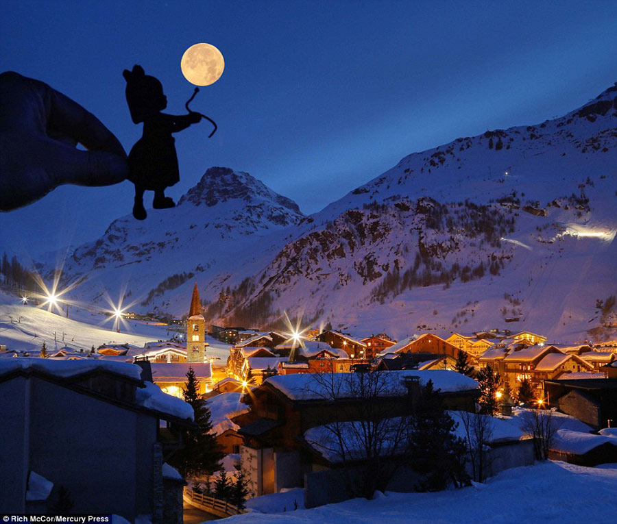 The moon appears as a little girl's balloon in this tranquil nighttime scene at Val D'Isere in France.