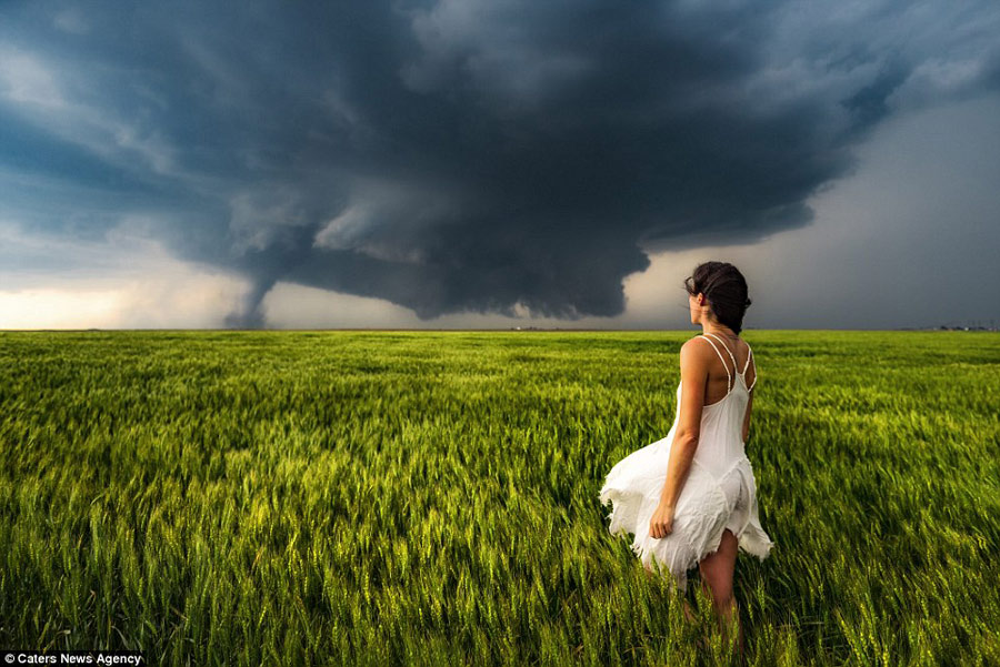 Brave model! Elisabeth Brentano fearlessly walks towards the looming storm front during a photoshoot in Dodge City, Kansas in 2015.