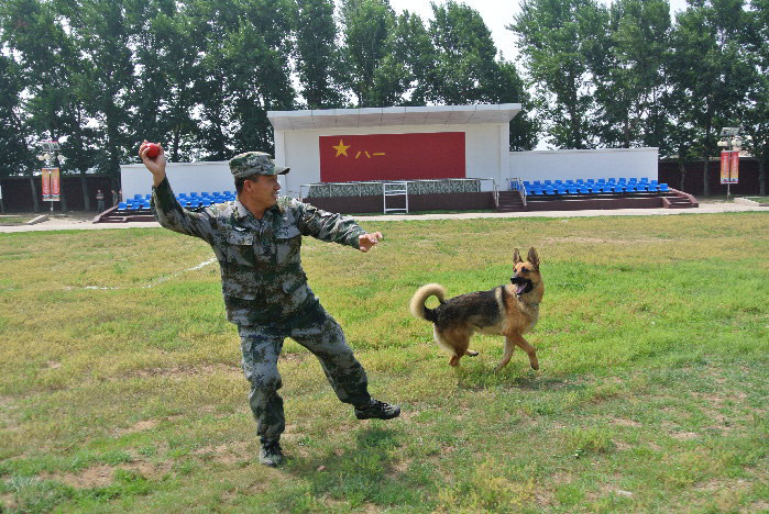 Sgt. IV Hou Guijun, a military working dog (MWD) handler, and Youyou (R), a military working dog, conduct obedience training at a MWD training base in Beijing on July 6, 2016. Seven MWD handlers from the MWD training base under the PLA Army carried out a training exercise with their dogs recently in preparation for the International Military Working Dog Competition codenamed "Loyal Partner" to be held in Russia in late July. It will be the first time for the PLA to participate in such a competition. (ChinaMil/Cao Xuan)