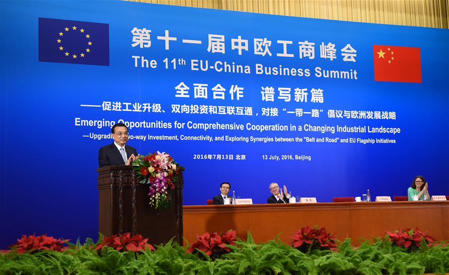 Chinese Premier Li Keqiang delivers a speech at the 11th EU-China Business Summit in Beijing, capital of China, July 13, 2016. European Commission President Jean-Claude Juncker (2nd R) also attended the summit. [Photo: Xinhua]