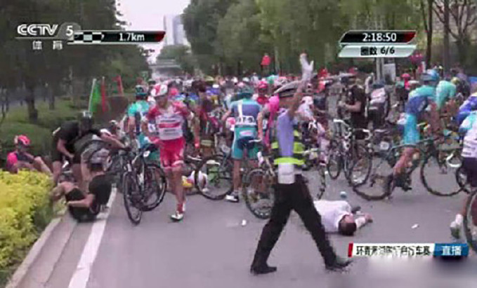 A mass crash happens on the 1st day of Tour de Qinghai Lake 2016 (??TDQL2016?) in northwest China on Sunday as a man dashed himself into cycling athletes.