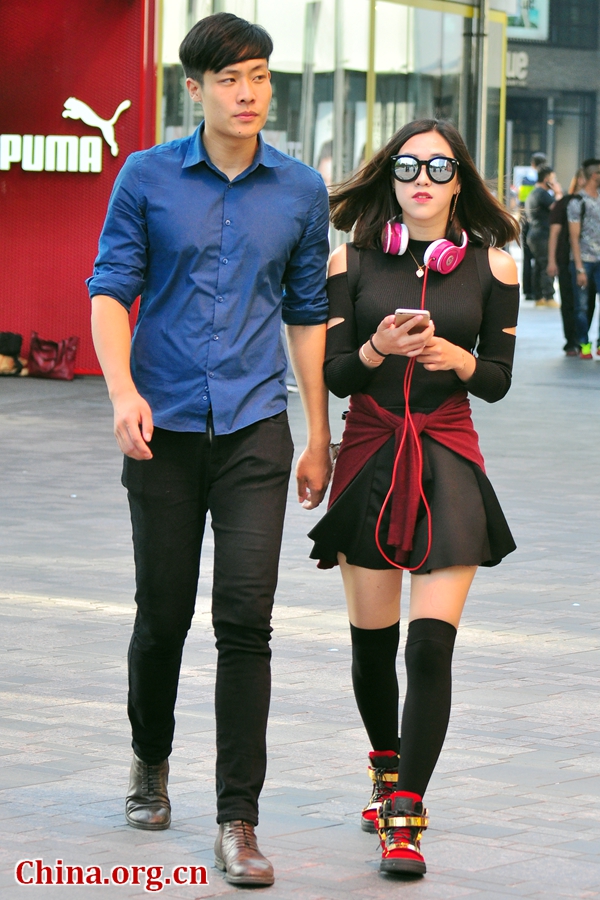 A woman wearing a cold-shoulder dress walks through the Sanlitun streets in Beijing's eastern Chaoyang District with her friend in mid June. [Photo by Guo Yiming / China.org.cn]